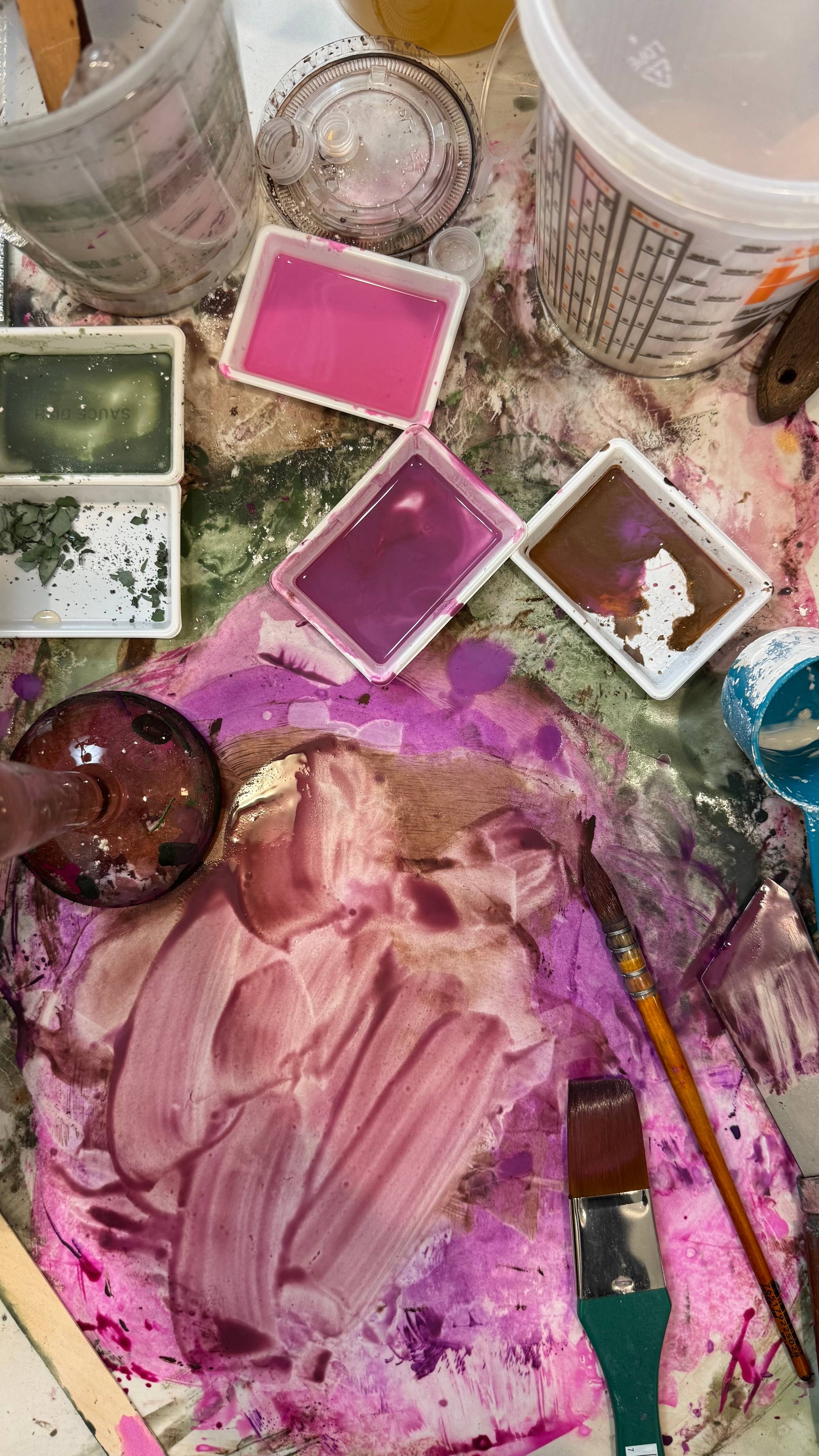 The BEAUTIFUL MESS on my paint making table…testing..mixing…