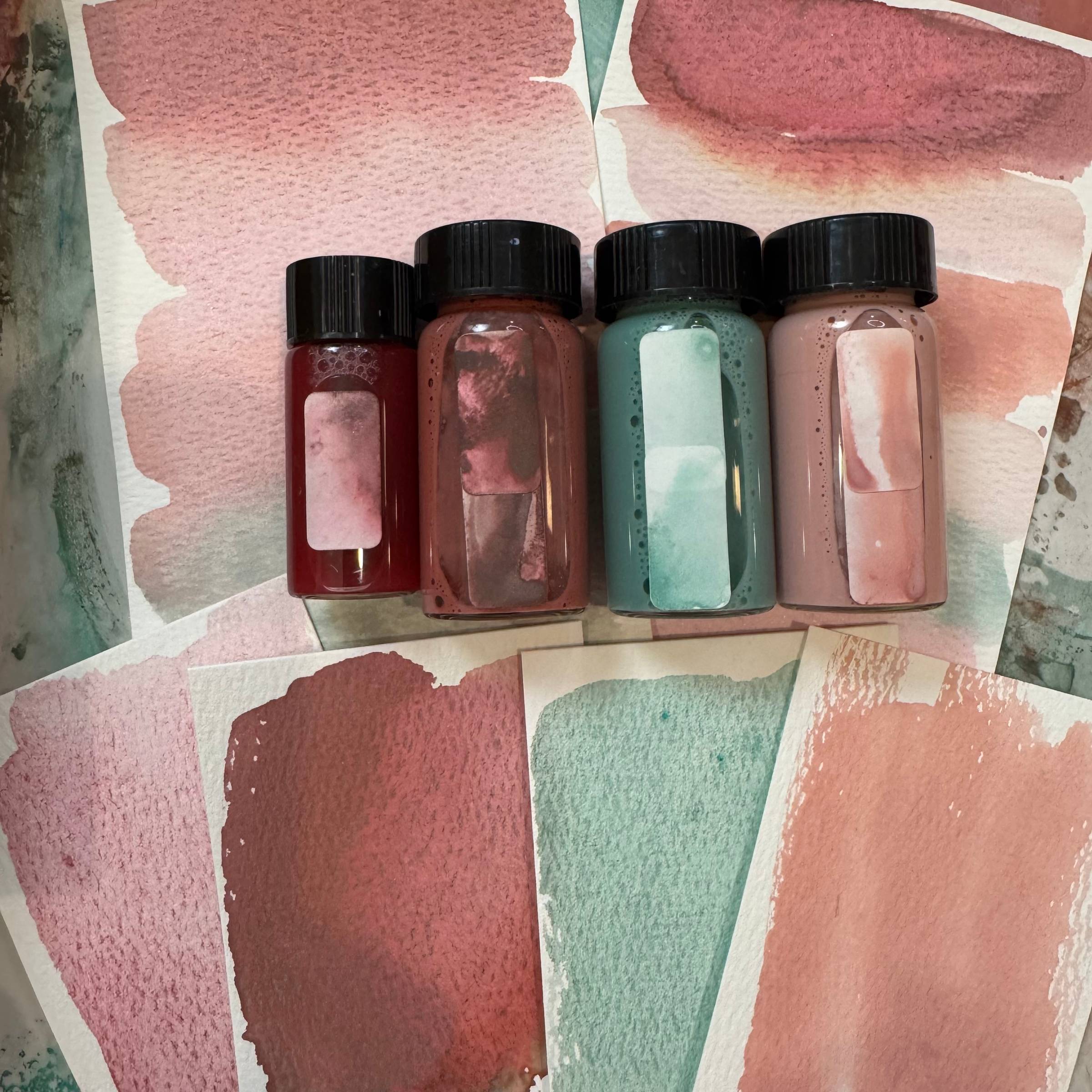 I made a few extra sets when I was formulating this collection — deep crimson, dusty rose, patina teal, warm blush — the full color story in hand-poured bottles. They went fast. I have just a few left, and when they’re gone, that’s it for this collection.