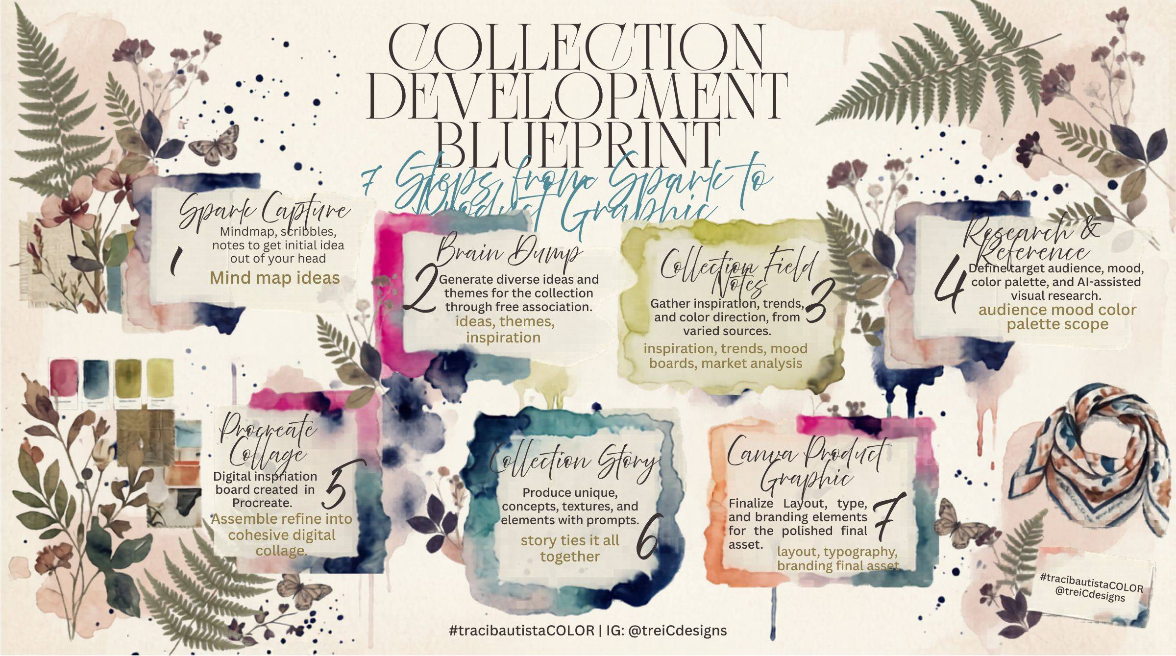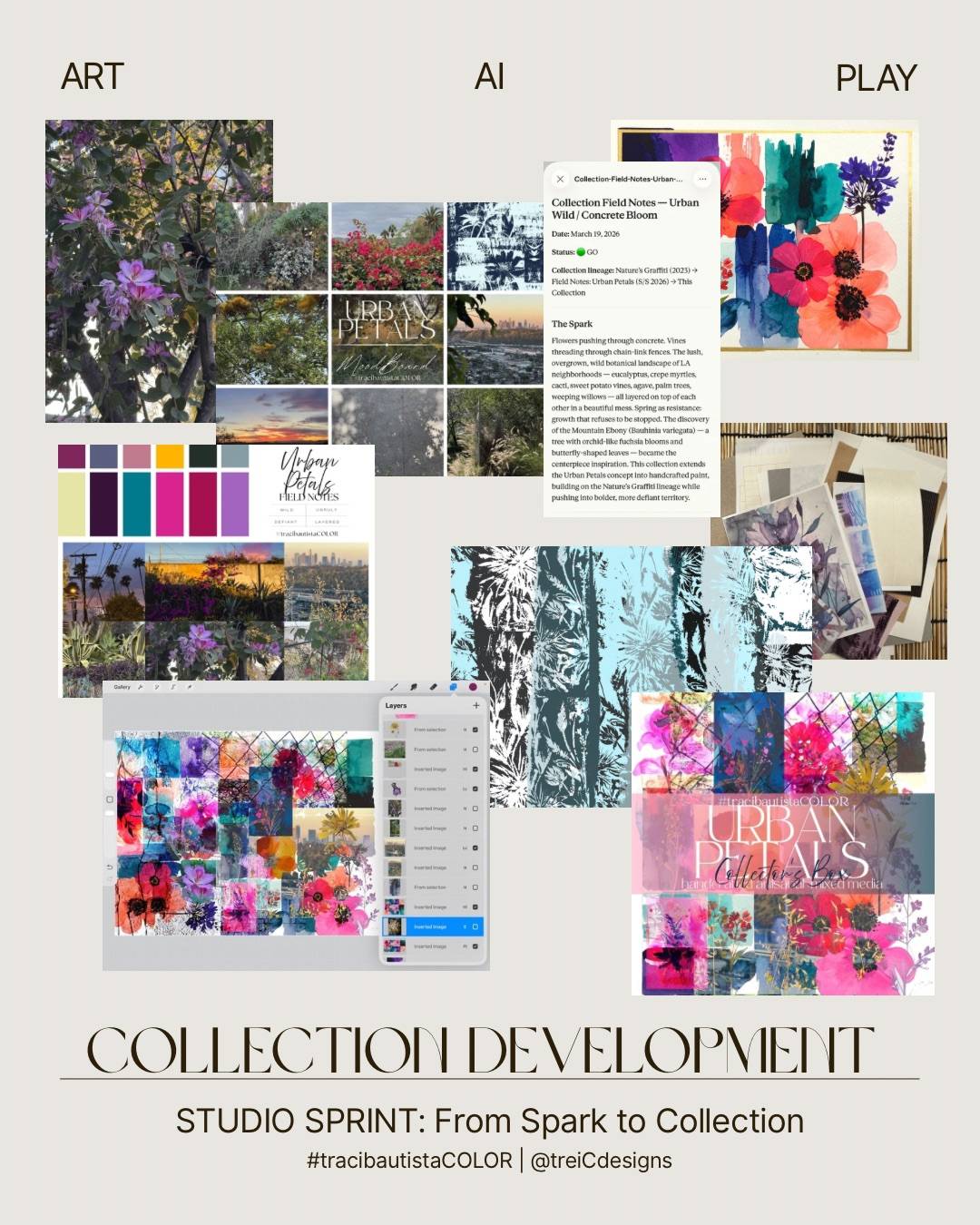 Session 2 (May 5): From Field Notes to Inspiration Board — refine your color direction, generate collection research and reference images using AI, and build a digital inspiration board in Procreate. Plus a before-and-after look at how I turn a collection direction into product graphics in Canva.